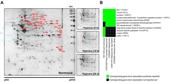 We found 64 spots that showed significant expression changes in human ASCs under hypoxic conditions using 2-DE combined with MALDI-TOF MS analysis (Figure 1 and Table 2). In addition, DisGeNET database analysis of gene–disease associations showed seven genes (TLN1, VCL, ENO1, CAP1, P4HB, GAPDH, and WDR1) in the functional annotation clustering of DAVID informatics and seven genes (GAPDH, P4HB, LMNA, WDR1, PLOD1, MSN, and PDCK6IP) in the miRNet analytics platform among the 64 spots associated with bone-related diseases, such as osteoarthritis and osteoporosis (Figure 1B and Figure 2). With comprehensive functional annotation, preconditioning ASCs under low oxygen tension improved the osteogenic differentiation potential [19,31], but there were also contradictory consequences [21,32]. These results suggest that the hypoxic environment of ASCs can stimulate the secretion of osteogenic-differentiation-related factors and directly affect the osteogenic differentiation of cells. Therefore, we analyzed the secretome in hypoxic ASC-derived CM (Figure 3), and osteocyte differentiation of the detected proteins was investigated (Figure 4).