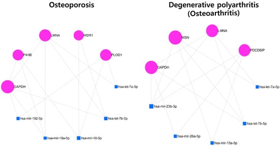 The 2-DE-based proteomic experiments were performed to observe changes in protein expression over time under hypoxic conditions in human ASCs. Proteins were separated into two steps using pH 3–10 IEF strips and 12% (w/v) SDS-PAGE. Approximately 700 individual spots with pH values between 3 and 10 and molecular weights between 6 and 240 kDa were detected (Figure 1). Among the 700 individual spots, 84 spots were significantly regulated in ASCs in a hypoxic environment, and 64 spots were identified using peptide mass fingerprinting (PMF) with matrix-assisted laser desorption/ionization (MALDI) time-of-flight (TOF) mass spectrometry (MS) (Figure 1A, Table 2, Supplementary Figure S1, and Supplementary Table S1). We carried out network analysis using the gene names of 64 proteins for DAVID functional annotation tools. The functional classification tool lists genes into functionally related groups to help unravel the biological content in gene functional classification. Gene functional classification results show gene members and their associated annotation terms in a 2D view. The highest enrichment scores include those for osteoporosis, posttraumatic osteoporosis, and cell membrane functions. Therefore, we discovered that seven genes (TLN1, VCL, ENO1, CAP1, P4HB, GAPDH, and WDR1) were related to osteoporosis by the DisGeNet database, and nine genes (TLN1, VCL, ENO1, CAP1, P4HB, HSPA8, USP14, MSN, and CFL1) were associated with the cell membrane by UniProtKB_Cellular Components (Figure 1B). In addition, target interaction network analysis by network-based visual analysis (miRNet) showed that five genes (GAPDH, PLOD1, LMNA, WDR1, and P4HB) with five miRNAs (hsa-let-7a/b-5p, hsa-let-7b-5p, hsa-mir-16-5p, hsa-mir-18a-5p, and hsa-mir-192-5p) were associated with osteoporosis by DisGeNET (Figure 2). Four target genes (LMNA, MSN, PDCD6IP, and GAPDH) with five miRNAs (hsa-let-7a-5p, hsa-let-7b-5p, hsa-mir-15a-5p, hsa-mir-26a-5p, and hsa-mir-23b-3p) were associated with the pathway in osteoarthritis according to the results of the miRNet network analysis.