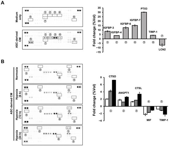 In addition to the changes in protein expression in ASCs under low oxygen tension, ASC-derived CM containing secreted proteins was also investigated using an adipokine array that can detect 58 different cytokines (Supplementary Table S2). Above all, the expression levels of CM-derived cytokines were compared to those of the seven detected CM-derived adipokines (insulin-like growth factor-binding protein (IGFBP)-3, IGFBP-4, IGFBP-6, IGFBP-7, pentraxin (PTX) 3, TIMP metallopeptidase inhibitor (TIMP)-1, and lipocalin (LCN) 2), which were more than twice or less than twice as expressed as CM-derived cytokines (Figure 3A). Moreover, the expression levels of hypoxic CM-derived adipokines (6, 12, or 24 h) were compared to normoxic CM-derived adipokines individually, and five adipokines (cathepsin (CTS) D, angiopoietin (ANGPT) 1, CTSL, macrophage migration inhibitory factor (MIF), and TIMP-1) were found to have increased or decreased more than twice as much as the normoxic CM-derived adipokines (Figure 3B).
