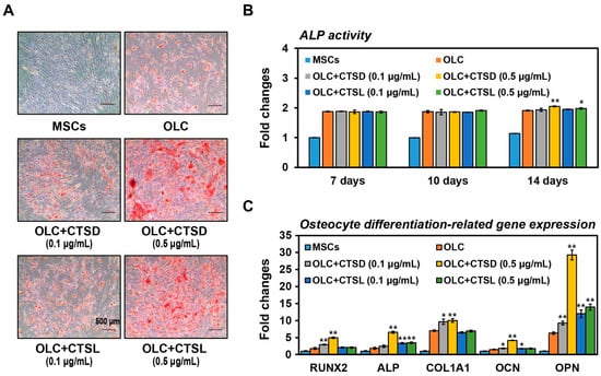 Human ASCs (Lonza, Walkerville, MD, USA) and BM-MSCs (Lonza) were cultured in 10% fetal bovine serum (FBS; HyClone, Logan, UT, USA)-supplemented Dulbecco’s modified Eagle’s medium (DMEM; HyClone) with 1% penicillin/streptomycin (HyClone) at a density of 5 × 104 cells/cm2 in a 100 mm dish in a humidified atmosphere with 5% CO2 at 37 °C. Fourth-passage ASCs and BM-MSCs were used in this study. To induce osteocyte differentiation of BM-MSCs, we employed the StemPro osteogenesis differentiation kit (Gibco, Grand Island, NY, USA). BM-MSCs were seeded at a density of 5 × 103 cells/cm2 in 12-well plates, and the complete osteogenesis differentiation medium was replenished every three days over a 21-day period with and without the addition of native human CTSD or CTSL proteins (Abcam, Cambridge, MA, USA). Throughout this experiment, we conducted specific assessments at various time points, including alkaline phosphatase assays at days 7, 10, and 14; alizarin red S staining at day 21; and gene expression analysis at day 21.