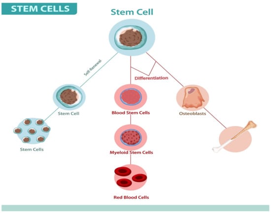 SCs are primary human body cells, with the capability to divide indefinitely and develop into specialized cells for the body tissues, as shown in Figure 1. These cells have a critical role in the repair of lost or damaged cells because of illness or injury. SCs have also drawn a lot of interest as a potential therapeutic approach for a diverse range of diseases and conditions [1].