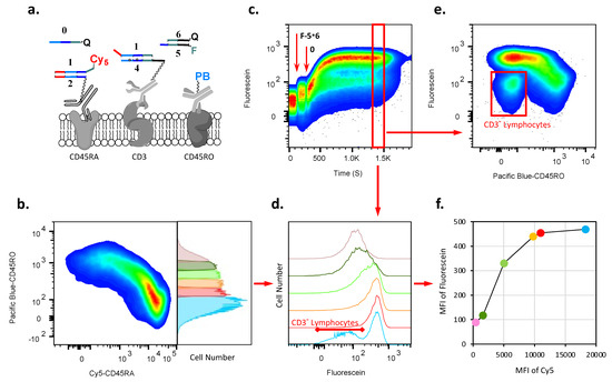 In order to demonstrate amplification (Figure 2bandFigure 3a), we first applied conjugates of anti-CD19 and anti-CD45 antibodies with duplexes Cy5- (1 was labeled here with Cy5) and (1 was unlabeled), respectively. The ratio of oligonucleotide-to-antibody for CD19 was about 1.9 and for CD45 was about 1.2. Further, to confirm the subpopulation at which the cascade occurs, we also additionally labeled B cells within PBMCs with anti-CD20 antibodies conjugated with Pacific Blue fluorochrome. Once the conjugates had been deposited, we added fluorescein-labeled complex (F--FQ) to the solution and then initiated the cascade with 0 (Figure 3c, addition events are shown by red arrows).