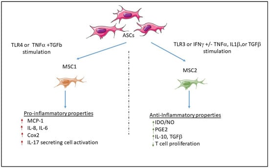 Waterman et al. proposed that two phenotypes of pro-inflammatory or immunosuppressive MSCs, named MSC 1 or MSC2, respectively, could be differentially activated through toll-like receptor (TLR) 4 or 3, respectively. Indeed, they found that LPS was able to activate MSC1 through TLR4, a pattern recognition receptor that recognizes conserved pathogen-associated molecular patterns (PAMPs) from bacterial origin, while polyinosinic-polycytidylic acid (Poly:IC) activated MSC2 through TLR3, which recognizes PAMPs from viral origin. Thus, LPS-stimulated MSC1 expressed higher levels of IL-6 and IL-8 mRNAs than poly(I:C)-stimulated MSC2, which inversely expressed immunomodulatory factors, such as IDO, PGE2, and IL-10, at much higher levels than LPS-stimulated MSC1 []. Similar observations have been made for ASCs, which, depending on TLR3 or TLR4 stimuli, could behave as immunomodulatory or inflammatory cells, respectively [].