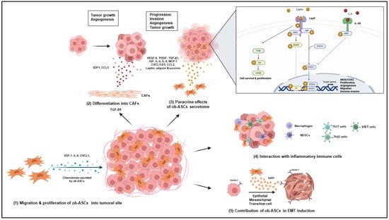 ASCs’ secretome modifications in obesity result in increased production of growth factors, cytokines, chemokines, and adipokines. Among them, angiogenic factors, such as VEGF-A and PDGF; cytokines, such as transforming growth factor-β1 (TGF- β1), insulin-like growth factor (IGF), IL-6, and IL-8; and chemokines, such as C-X-C Motif Chemokine Ligand (CXCL)1/2/5 and C-C motif chemokine ligand (CCL)-2, also named monocyte chemoattractant protein 1 (MCP-1), have been shown to play important roles in stimulating cancer progression []. Increased secretion of hormones, such as leptin, adipsin, and survivin, by obese ASCs is also involved in cancer development.