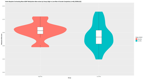 Violin Boxplots Contrasting Mean BDNF Methylation Beta-values by Group (High or Low-Risk of Suicide Completion) (n = 60) [FEMALES]. To investigate associations between mean BDNF-associated promoter methylation and severe clinical psychiatric phenotypes, we studied mean methylation M-values across 16 BDNF-associated promoter CpG-sites. Beta-values were used for illustration. In this analysis, as clinical variables were largely comparable between the in silico stratified groups, mean BDNF DNA-methylation was compared between groups using the one-sided Wilcoxon signed rank sum exact test. Post hoc univariate analyses were performed to exclude confounders from age and BMI on DNA methylation levels, correlating mean BDNF methylation levels with these descriptive variables in using Pearson’s moment correlation coefficients. p-values < 0.05 were considered significant. DNA methylation levels were higher-methylated with dependence on severity of suicidal behavior (compared to lower-risk suicide attempters) (W = 227, p = 0.0299) (n = 60). Across all samples, non-M-transformed mean BDNF methylation beta-values were 0.06885 (SD = 0.0306) with a mean between-group difference of ~2.0%.