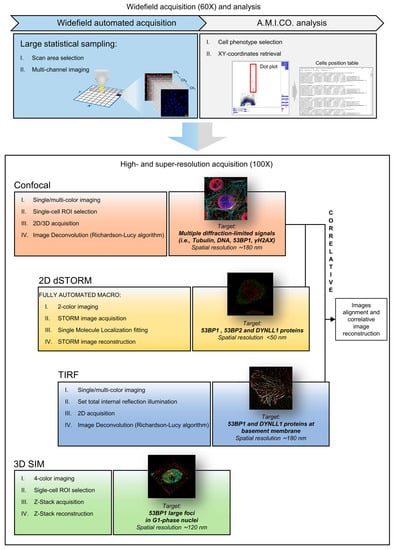 Multi-Modal Multi-Resolution Workflow for Correlative Experiments. First, images are collected by an automated fluorescence-microscopy workstation following an analysis-driven protocol (A.M.I.CO analysis) that allows the automated acquisition of multi-channel images with high resolution and their processing to identify single events. Cell targets of interest (specific cell phenotypes) are thus selected and physically retrieved on the microscope by converting the image coordinates into stage positions. High- and super-resolution imaging (including confocal, STORM, TIRF, and related correlative modalities) is then performed on the targeted regions.