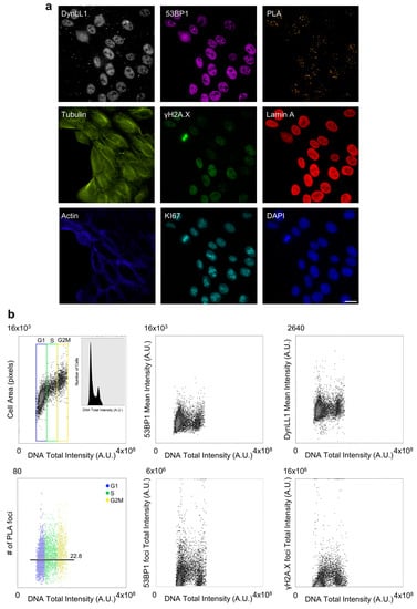 A Proximity Ligation Assay (PLA) was employed to highlight and localize the sites of the 53BP1-DynLL1 interactions. PLA detection, thanks to the wide spectral range of the widefield microscope, was coupled to the staining of other eight antigens (Figure 3a) to delineate intracellular structures or to provide evidence of functional cell states: (i) DNA, for cell cycle localization and nucleus marking; (ii) Actin, to delineate cell membranes particularly during the mitotic phase; (iii) KI67; and (iv) Lamin A to mark proliferation activity (KI67 was also employed as a mitotic marker (together with γH2A.X), while Lamin A was useful to detect prophase and telophase onset); (v) γH2A.X was used to quantify and localize DNA damage; (vi) Tubulin for the spindle visualization; (vii) 53BP1; and (viii) DynLL1, to measure their expression profile and localization during the cell cycle.