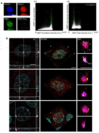 The distribution of 53BP1-DynLL1 sites of interactions was consequently (i) quantified at high sensitivity; (ii) “temporally localized” during the cell cycle, demonstrating that it is not phase-specific; (iii) spatially localized in cell compartments, detecting its presence in both nuclear and cytoplasmic space; and (iv) targeted in intracellular structures, e.g., γH2A.X foci. The statistical sampling reached is in the order of thousands of cells (n = 5156) (Figure 3b), with the simultaneous optimization of signal-to-noise ratio and spatial resolution (diffraction limited at NA 1.4).