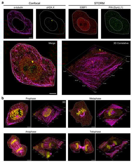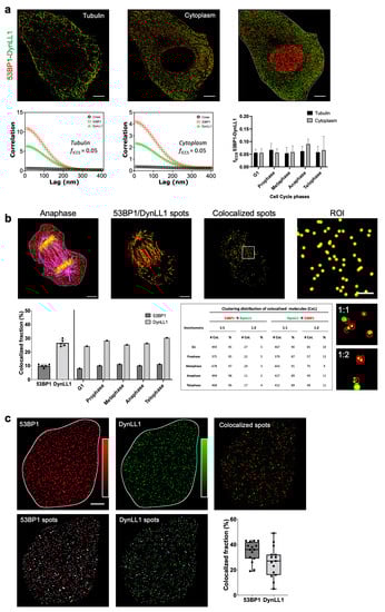 To obtain a precise quantification of the putative interaction, clustered (50 nm) STORM images were segmented, employing the A.M.I.CO software in the two channels and in the different phases of mitosis (Figure 9b). A mask of the microtubule network was simultaneously created by the registered confocal data. Clusters separated by a relative distance of 50 nm were considered adjacent. The analysis confirmed a mitosis-stage-independent interaction with a 1-to-1 ratio (between 90–98% for the 53BP1 and 87–91% for the DynLL1 colocalizing fractions) between the clusters of the two molecular species.