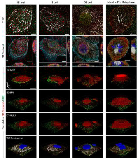 Correlative Confocal-TIRF Analysis on Image-Cytometry re-localized cells. Representative re-localized cells in different cell-cycle phases (G1, S, G2, M) acquired by the correlative Confocal-TIRF protocol described in the text. TIRF images of 53BP1, DynLL1, and Tubulin were first acquired, followed by Confocal Z-Stacks of 53BP1 (Green), DynLL1 (Red), Tubulin (White), Phalloidin (Cyan), and Hoechst (Blue). The TIRF plane is identified in the Z-Stack, aligned, and merged at the corresponding position and then inserted into the Z-stack (3D projections). The rows show (from top to bottom): TIRF images, lateral planes reconstructions of Confocal Z-Stacks (scale bar: 5 µm), and correlative 3D volume projections (scale bar: 10 µm) of Tubulin, 53BP1, DynLL1, and Hoechst. Three-dimensional projections show the proteins distribution at the basal membrane and in the cell volume (red: confocal; green: TIRF).