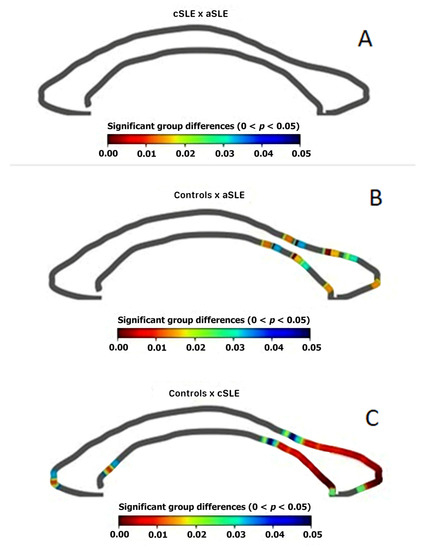 Comparison of mid-sagittal area of corpus callosum between the groups, showing a reduced area in the posterior region of the corpus callosum when comparing the controls and cSLE (C), the controls and aSLE (B), and similar areas in cSLE and aSLE (A).