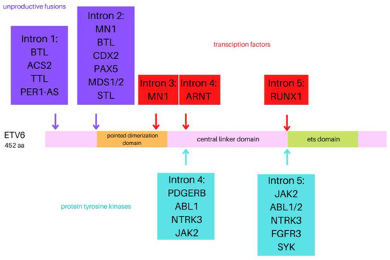 The ETV6 gene (formerly known as TEL)consists of eight exons spanning 240 kb and is located on chromosome 12p13.2. It has been identified as a fusion partner in over 30 chromosomal translocation oncogenes. This gene encodes the essential hematopoietic transcriptional repressor erythroblast transformation specific (ETS) variant 6. Six isoforms of the ETV6 are distinguished, ranging in length from 245 to 452 aminoacids [10,11]. The transcript consists of three functional domains: an N-terminal pointed dimerization domain, also termed helix loop helix (HLH), or sterile alpha motif domain, a central linker domain, and an 85-amino acid C-terminal DNA-binding domain enabling the association with the promoter region of target genes [12]. The 57-kDa ETV6 protein belongs to the ETS superfamily of transcription factors associated with numerous biological processes and pathways, such as cell growth and differentiation, hematopoiesis, angiogenesis, and megakaryocyte development. ETV6 is highly expressed in early hematopoietic progenitor cells and is essential for hematopoiesis in the bone marrow [13,14]. At first, ETV6 was identified as the fusion partner of the platelet-derived growth factor receptor beta gene (PDGFRB) in a balanced t(5;12)(q21;p13) translocation from a patient with chronic myelomonocytic leukemia. In translocations involving MN1, BTL, and PAX5 (Figure 1), the DNA-binding domain of ETV6 is part of the leukemogenic fusion protein, which suggests that altered expression of normal ETV6 target genes is involved in the pathogenesis of leukemia [15,16,17]. The somatic or germline mutations in ETV6 have been shown to contribute to malignancies such as hematologic malignancies, including myelodysplastic syndrome (MDS), acute myeloid leukemia (AML), high-risk B-ALL, early T-cell precursor (ETP) ALL, diffuse large B-cell lymphoma (DLBCL), melanoma, and colon, salivary gland, and breast cancer [18,19]. Furthermore, a relationship between heterozygous germline ETV6 mutations to dominantly inherited thrombocytopenia and predisposition to hematologic malignancies was defined [20,21].