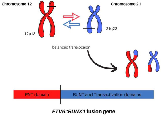 In the course of the past decades, improvements have been made in understanding the precise role of the ETV6::RUNX1 fusion gene product in childhood ALL. ETV6 and RUNX1 encode transcription factors that play important roles in hematopoiesis, and deficiency in either result in the failure of embryonic hematopoiesis. The ETV6::RUNX1 transcript fuses ETV6 exons 1 through 5 with RUNX1 exons 2 through 8. The resulting ETV6::RUNX1 fusion transcript is controlled by the ETV6 promoter and includes the N-terminal HLH domains of ETV6 connected to a large C-terminal part of the RUNX1 coding sequence, containing the Runt and transactivation domains. This contrasts with RUNX1 fusion genes found in AML, which are controlled by the RUNX1 promoter and lack the RUNX1 C-terminus along with the transactivation domain (Figure 2) [45].