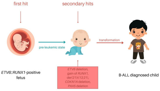 Despite the high occurrence of t(12;21) in B-ALL, the translocation was shown to be insufficient to induce leukemic transformation on its own [13]. The ETV6::RUNX1 fusion protein induces a silent preleukemic clone. The ETV6::RUNX1+ HSCs are able to self-renew, and they contribute to hematopoiesis; however, they differ from typical HSCs [51]. The translocation is usually acquired in utero in very early progenitor cells, prior to T- or B-cell receptor gene rearrangements [54]. As mentioned above, additional genetic hits are needed for the transition to leukemia. The further alterations are acquired independently with no preferential order, and they may include loss of ETV6 or alterations directed to genes regulating regular B-cell differentiation [52]. These genetic modifications can be obtained after years of latency and lead to ALL development (Figure 4) [29].