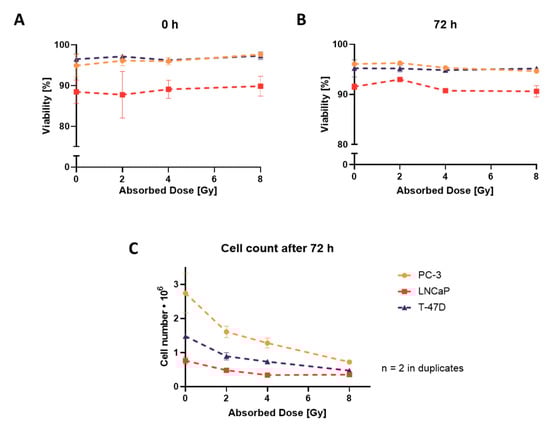 Trypan Blue Exclusion Assay: evaluation of cell viability and proliferation in monolayers. Cell viability immediately (0 h; (A)) and 72 h (B) after irradiation. (C) Cell count 72 h after irradiation. (A–C) Graphs are plotted as mean ± standard deviation from two independent experiments (n = 2) performed in duplicates.