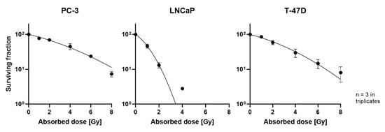Cell survival and reproductive ability after irradiation were determined by performing standard clonogenic assays [23]. 250 PC-3/T-47D or 1000 LNCaP cells were seeded in 6-well plates prefilled with 2 mL of respective medium. On the following day, plates were irradiated with 1, 2, 4, 6 or 8 Gy. After irradiation, PC-3 cells were further cultured for 7 days, T-47D for 14 days and LNCaP for 21 days, with their media being changed once per week. After the respective culturing periods, cells were washed with PBS, fixed with methanol for 30 min at 4 °C and, after another washing step, stained with crystal violet (Sigma-Aldrich; 1% in water) for 3 min. To assess the reproductive ability, stained colonies were counted using a Fusion FX7 (Vilber Lourmat, Eberhardzell, Germany). Three independent experiments were performed in triplicate for each cell line. Plating efficiency was calculated by dividing the average number of colonies in the control by the number of seeded cells. Plating efficiency was then multiplied with the number of colonies after treatment, resulting in the Surviving fraction (SF). Coefficients (α, β) were determined by linear quadratic curve fitting using Equation (1). D corresponds to radiation dose in Gray (Gy).