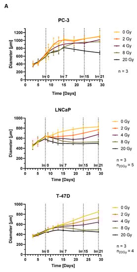 Spheroid growth was cell line dependent and is shown in Figure 3A. Non irradiated PC-3 spheroids showed exponential growth until day 15, whereas LNCaP and T-47D controls grew rather linearly, LNCaP until day 15 and T-47D until the end of the measured time period. LNCaP and PC-3 reached a plateau at a diameter of around 0.8 and 1 mm, respectively.