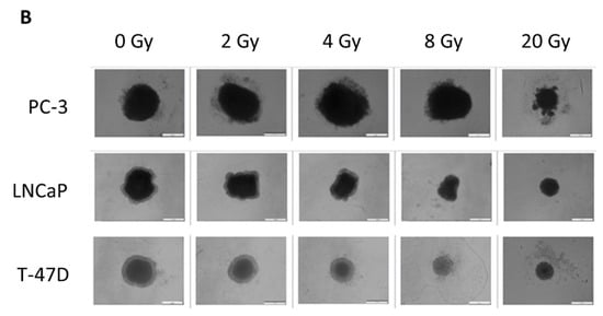 The following supporting information can be downloaded at: https://www.mdpi.com/article/10.3390/cells12030360/s1, Figure S1: Growth analysis of spheroids LNCaP and T-47D + Geltrex after single irradiation with 0, 2, 4, 8 or 20 Gy on day 8 (Irr 0); Figure S2: Representative clonogenic assay evaluation; Figure S3: Time lapse growth analysis; Figure S4: Live/dead stainings of spheroids; Figure S5: Western Blots.