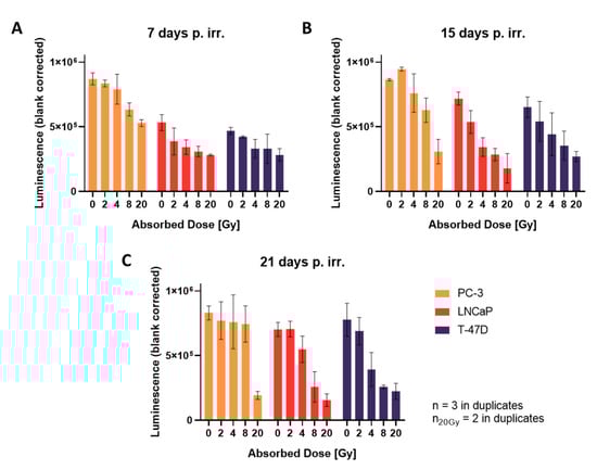 Cell viability of spheroids, (A) 7, (B) 15 and (C) 21 days after irradiation; plotted as mean ± standard deviation from three independent experiments (n = 3), each performed in duplicates; p. irr. = post irradiation.