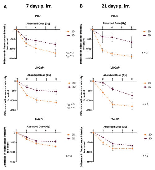 Assessment of difference in fluorescence intensity (metabolic activity) to control between 2D and 3D (A) 7 and (B) 21 days after irradiation; plotted as mean ± standard deviation from three to four independent experiments (n = 3–4), each performed in triplicate; p. irr. = post irradiation.
