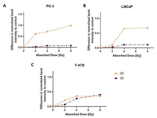 Differences in normalized γH2AX band intensity to control, compared between 2D and 3D directly after irradiation for (A) PC-3, (B) LNCaP and (C) T-47D.