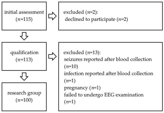 The patient group consisted of 100 successive adult patients with epilepsy who attended the outpatient clinic of the Institute of Psychiatry and Neurology in Warsaw, Poland. Strict inclusion and exclusion criteria were applied for the recruitment of the study participants (Table 1). We included patients after a 7-day period of seizure freedom based on our previous results [24,32]. The exclusion criteria included factors which could influence the examined markers with the exception of disease activity, which did not affect qualification to the study. The same exclusion criteria were applied for control group. The qualification took place in the period from 20 July 2015 to 21 July 2017. All the patients confirmed their willingness to participate in the study by signing informed consent.