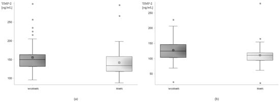 Sex-related differences in serum level of TIMP-2 in (a) patients with epilepsy and (b) control group. Box plot.