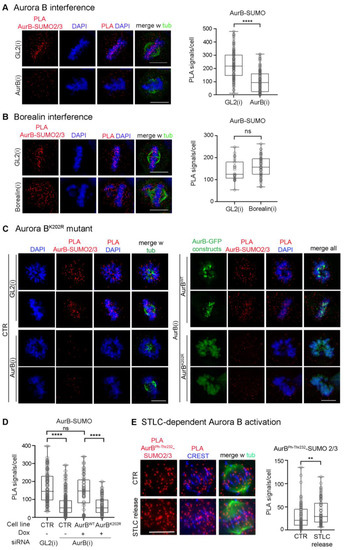 Aurora B-SUMO2/3 ligation products in prometaphase and metaphase HeLa cells. (A) Aurora B-SUMO2/3 PLA signals disappear in cells interfered for Aurora B, indicated as AurB(i). Control cultures were treated for RNA interference with neutral siRNAs targeting the firefly luciferase, indicated as GL2(i). The box plot represents the distribution of PLA signals in prometaphase and metaphase in control vs. Aurora B-interfered cultures (140 counted cells/group in 3 experiments); ****, extremely highly significant difference (p < 0.0001, Mann–Whitney test). (B) Aurora B-SUMO2/3 PLA signals persist in Borealin-interfered cells, which display extensive chromosome misalignment. The box plot on the right shows the abundance of Aurora B-SUMO 2/3 PLA signals/cell as described in (A) (60 counted cells/group, 2 experiments). ns, non-significant differences. (C) Mutation of K202 abolishes Aurora B PLA signals with SUMO2/3 peptides. Left: Aurora B-SUMO2/3 PLA products in control (CTR) HeLa cultures interfered with neutral (GL2) or with Aurora B-specific siRNAs: the latter abolished the PLA signals. Right: after interference to endogenous Aurora B, PLA assays depict SUMO2/3 products with dox-inducible Aurora B only in the cell line expressing wild-type kinase, but not Aurora BK202R mutant. (D) Quantification of Aurora B and SUMO2/3 PLA signals in the cell lines indicated in (C). + and − indicate dox addition. At least 60 cells per sample were counted (2 experiments). ns, non-significant difference; ****, p < 0.0001. (E) Aurora BphThr232-SUMO2/3 PLA products under conditions that increase merotelic attachments. The box plot quantifies Aurora BphThr232-SUMO2/3 PLA signals in controls (60) and STLC-released (86) cells (2 experiments): PLA signals increase in parallel with the increase in Aurora BphThr232 (**, p < 0.01). The Mann–Whitney test was used for all comparisons.