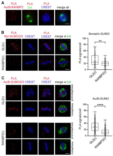 Biochemical assays using synchronised cell extracts showed that RANBP2 is required for SUMO conjugation of Borealin, and that this modification peaks in early mitotic extracts and declines in later stage extracts [37]. That temporal pattern parallels that observed here for Aurora B-SUMO2/3 PLA products (Figure 2A) and is consistent with the localisation of RANBP2 during mitosis: when the nuclear envelope dissolves at mitotic entry, RANBP2 localises to the spindle microtubules, a fraction is gradually delivered to kinetochores as microtubules to establish contact with them. Thus, RANBP2 reaches its highest concentration at kinetochores in metaphase, when chromosomes are fully aligned [26,27,28] and PIAS 3 detaches from them [39]. In early anaphase, RANBP2 remains at kinetochores and detaches from them in late anaphase/telophase to be recruited around the segregating chromosomes [26], and our unpublished data. Therefore, a significant RANBP2 fraction is in close proximity to both Aurora B and Borealin at kinetochores in the prophase-to-metaphase window, during which both proteins form SUMOylated products. We actually found that RANBP2 forms PLA ligation products with Aurora B, mostly localised between the spindle microtubules and CREST-stained kinetochores in prometaphase and metaphase (a representative prometaphase is shown in Figure 5A), suggesting that the two proteins can interact therein.