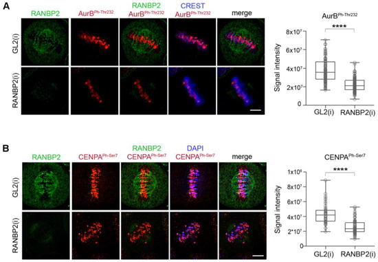 RANBP2 silencing impairs Aurora B autophosphorylation at Thr232 (A) and phosphorylation of CENP-A at Ser7 (B) at centromeres. Experiments were repeated three times. The quantitative analysis of markers in control (interfered with neutral GL2 siRNAs) and RANBP2-interfered cultures is shown in the box plot and the statistical analysis is as follows: AurBphThr232 (n, 100 for GL2 and 107 for RANBP2), **** p < 0.0001; CENP-Aph-ser7 (n, 45 and 72 cells) **** p < 0.0001.