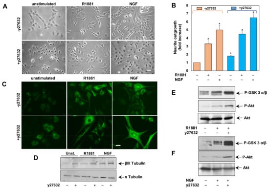 Since regeneration of sensory axons usually involves the PI3K/Akt pathway and NGF-induced neurite outgrowth requires Akt [], we finally assessed the role of GSK 3α/β/Akt activation in y27632-induced neurite outgrowth. Figure 3E,F show that R1881 (E) or NGF (F) induce within 5 min GSK 3α/β and Akt phosphorylation. Both the effects are robustly increased by treatment of PC12 cells with y27632.