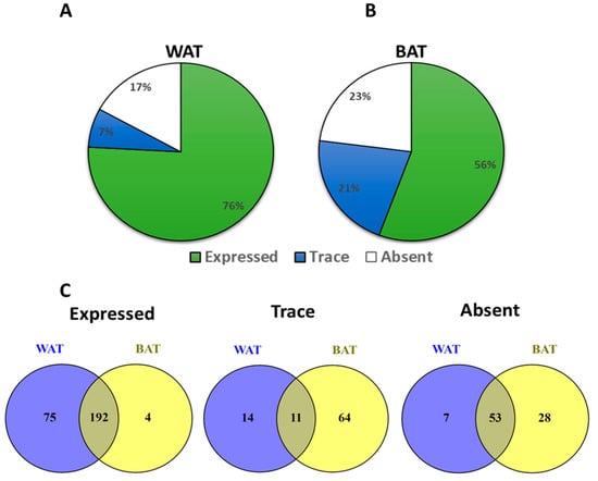 GPCRs expression in mouse White Adipose Tissue (WAT) and Brown Adipose Tissue (BAT). (A,B) Pi chart showing the proportion of expressed, trace and absent/undetected GPCRs in mouse WAT and BAT. (C) Venn diagrams showing the relationship (distinct or overlapping) between the expressed, traced and absent/undetected GPCRs identified in WAT and BAT mouse tissues. Each Data point represents an average mRNA expression of two independent experiments. The data are normalized to the average of 15 reference genes in the same sample as described in the method section.
