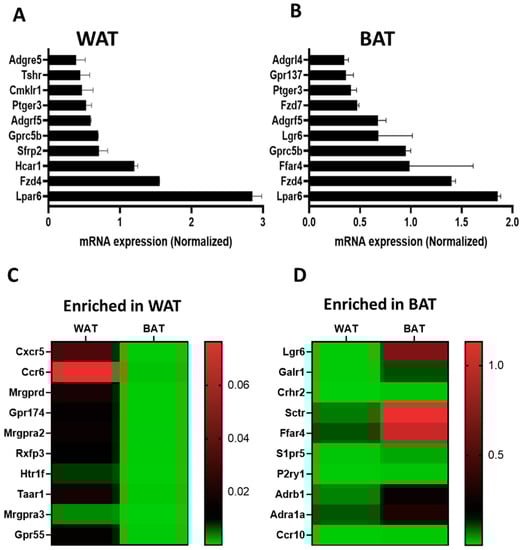 Comparison of highly expressed GPCRs between WAT and BAT. (A,B) mRNA expression of the top 10 expressed GPCRs in WAT and BAT. (C,D) Heat maps showing normalized gene expression profiles for ten most enriched GPCRs in WAT and BAT. Data were generated using pooled RNA of WAT and BAT samples obtained from five mice. Each Data point represents an average mRNA expression of two independent experiments. The data are normalized to the average of 15 reference genes in the same sample as described in the method section.