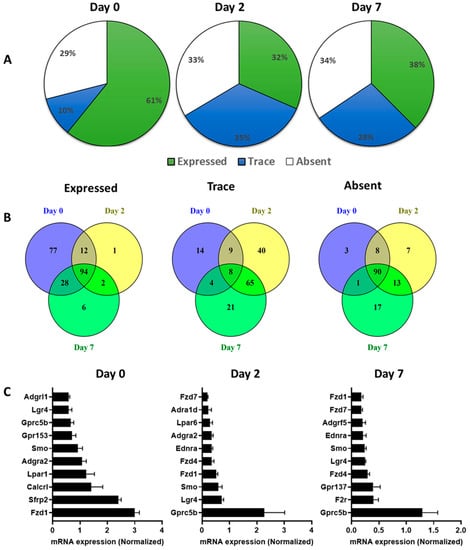The GPCR mRNA expression during the adipogenic differentiation of 3T3 L1 cells. (A) The fraction of the expressed, trace or absent GPCRs in the pre-adipocytes (Day 0), early adipocytes (Day 2) and mature adipocytes (Day 7). (B) Venn diagrams showing the exclusive or shared genes for expressed, trace or absent mouse GPCR mRNAs from at day 0 (Blue), at day 2 (Yellow) and at day 7 (Green). (C) mRNA expression of the top 10 expressed GPCRs at Day 0, Day 2 and DAY 7 of differentiating 3T3 L1 cells. Each Data point represents an average of three independent experiments. The data are normalized to the average of 15 reference genes in the same sample as described in the method section.