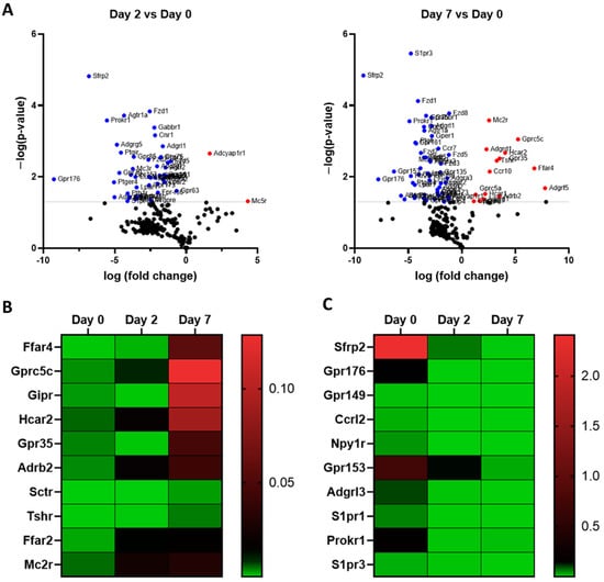 Differential expression of GPCRs in 3T3 L1 cells before and after differentiation (A) Volcano plot showing differentially expressed GPCRs genes, with -log (p-values) plotted against log (fold-changes) in Day2 and Day7 as compared to Day 0. GPCRs shown in color show a significant difference in expression with −Log (p-values) more than 1.3 which corresponds to p-values < 0.05. The GPCRs shown in red are upregulated whereas those in blue are downregulated (B,C) Heat maps showing normalized expression values for the 10 most downregulated and upregulated GPCRs during the differentiation of 3T3 L1 adipocytes. Each Data point represents an average of three independent experiments. The data are normalized to the average of 15 reference genes in the same sample as described in the method section.