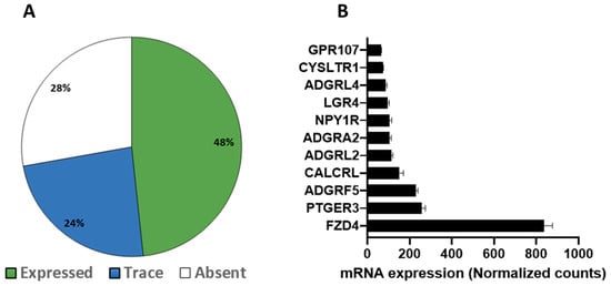 The GPCR mRNA repertoire in the subcutaneous adipose tissue of healthy human subjects from the RNA sequencing data set GSE 152,991 (A) The proportion of the expressed, trace and undetected GPCRs and (B) the most abundant GPCRs in the subcutaneous adipose of healthy human subjects. Each data point represent normalized mRNA counts from 11 healthy lean human subjects.