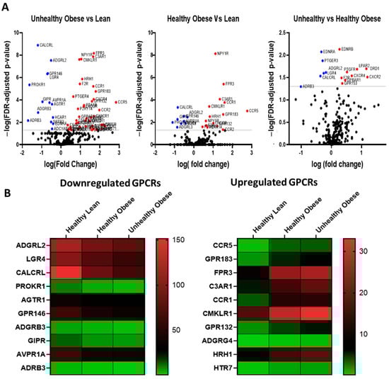 The GPCR mRNA repertoire in the subcutaneous adipose tissue of healthy lean, healthy obese and unhealthy obese human subjects. (A) Volcano plots showing differentially expressed GPCRs (FDR adjusted p-value < 0.05) in color, with FDR plotted against fold-change in subcutaneous adipose of unhealthy obese subjects versus lean, healthy obese versus lean, and unhealthy obese against healthy obese subjects. The GPCRs shown in red are upregulated whereas those in blue are downregulated. (B) Heat maps showing individual expression values for the 10 most downregulated and upregulated GPCRs in subcutaneous adipose tissue of human subjects without or with obesity. Each data point represent normalized mRNA counts from healthy lean (N = 11), healthy obese (N = 14), and unhealthy obese (N = 20) as described in the method section.