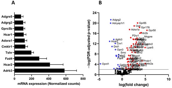 The GPCR mRNA repertoire in mouse adipocytes. (A) the most abundant GPCRs in the adipocytes isolated from healthy mouse adipose tissue and (B) Volcano plots showing differentially expressed GPCRs (FDR adjusted p-value < 0.01) in color, with FDR plotted against fold-change in adipocytes isolated from white adipose tissue of mice fed a high fat diet versus regular chow fed mice. The GPCRs shown in red are upregulated whereas those in blue are downregulated. Each data point represent normalized mRNA counts from 6 animals in each group.