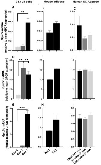 The GPCR5 group of receptors are part of the class C GPCR family and consist of four members GPRC5A, GPRC5B, GPRC5C, and GPRC5D. These are orphan GPCRs, and their expression is induced by retinoic acid. GPR5A is significantly upregulated during the adipogenesis process (Figure 8A) and is expressed at low levels in mouse adipose tissue (Figure 8B). GPCR5A is highly expressed in human adipose and is downregulated in obese subjects (Figure 8C). GPRC5B and GPRC5C are significantly upregulated during adipogenic differentiation of 3T3 L1 adipocytes (Figure 8D,G) and are highly expressed in mice (Figure 8E,H) and human adipose tissue (Figure 7F,I), suggesting their possible role in adipose function. GPRC5D is expressed at trace levels in human adipose but absent in mouse adipose tissues and adipocytes (data not shown).