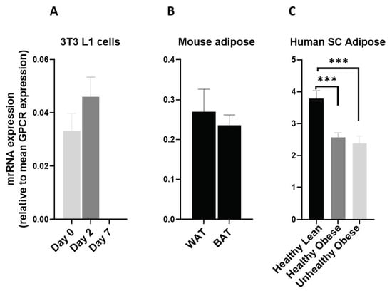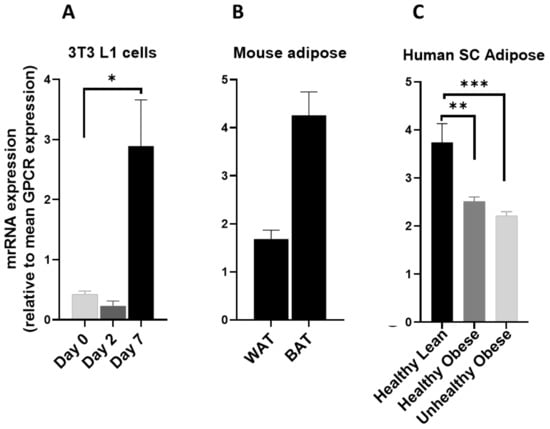 The G-protein coupled receptors (GPCRs) are the largest family of membrane proteins and are expressed widely in the body. They regulate several important biological processes, and dysregulation of GPCR signaling has been implicated in the pathogenesis of many diseases [1,2,3] There are ~800 members of the GPCR family and more than 400 are sensory receptors (olfactory, vision, and taste receptors). The remaining ~356 are non-sensory receptors and are activated by physical ligands [4]. The unique blend of variety and specificity within the GPCR family and the fact that they are readily targetable by exogenous drugs make GPCRs attractive therapeutic targets [5,6]. Roughly 30–40% of the currently marketed drugs target GPCRs. However, the overall number of targeted GPCRs is about 30% and a vast number of GPCRs are yet to be exploited for therapeutic purposes. In adipose tissue, GPCRs regulate critical processes such as adipogenesis, lipolysis, thermogenesis, glucose metabolism, and secretion of adipokines [7,8,9,10]. Of all the GPCRs, β-adrenergic receptors (βARs) have been comprehensively studied for their role in adipose metabolism [11,12,13,14]. All three members of the βAR family (β1, β2, and β3) are expressed in adipose with β3 AR being the predominant one. These βARs are stimulated by norepinephrine and signaling occurs via the activation of G-protein subunit Gαs leading to the accumulation of second messenger cAMP that phosphorylates and activates its downstream targets including cAMP-dependent protein kinase A (PKA). Activation of PKA leads to increased lipolysis via hormone-sensitive lipase (HSL), adipose triglyceride lipase (ATGL), and perilipin [11]. βARs are also involved in thermogenesis in brown adipose tissue [15]. In addition to the βARs, several other GPCRs have been shown to play important functional roles in white and brown fat including alpha-adrenergic receptors [16], free fatty acid receptors [7,17,18], adenosine receptors [19], adhesion receptors [20,21], hydroxycarboxylic acid receptors [22,23], and many others [9]. These still represent a significantly small fraction of the total number of GPCRs, and the functional significance of a vast majority of GPCRs is not known in adipose metabolism. This is to a certain extent due to the inadequate data regarding their expression in adipose tissue and differentiating adipocytes. Therefore, this study was initiated to comprehensively profile the entire repertoire of non-visual GPCRs, using high-throughput RT-PCR in mouse brown and white adipose tissue and during adipogenic differentiation of 3T3-L1 cells. In addition, the expression of GPCRs in subcutaneous adipose tissues from healthy lean, healthy obese and unhealthy obese human subjects as well as in adipocytes from mice fed a normal or high-fat diet was assessed by re-analyzing RNA-sequencing data [24,25]. Our comprehensive analysis revealed several GPCRs with no known role in adipose biology that were highly expressed in adipose tissue and demonstrated significant changes in expression during adipogenesis and/or in diseased human subjects. Understanding the role of these recently discovered GPCRs in the metabolism of adipose tissue could lead to the discovery of previously unrecognized disease-drug relationships and speed up the process of developing new drugs for obesity and metabolic disorders.