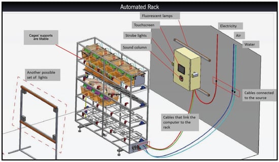 Representative scheme of the automated rack. The design is based on a traditional rack and the whole system is programmed and controlled via a computer allocated to the automated rack, allowing the scheduling of protocols and specific stressors.