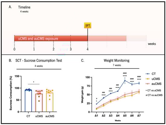 Effects of uCMS- and auCMS exposure on anhedonic behavior at the fourth week of the protocol and weight variation during the experimental protocols. Experimental timeline (A). Assessment of anhedonic behavior through the SCT at the fourth week of the protocol (B). Weekly monitoring of animals’ weights during the whole protocol of stress exposure to monitor alterations induced by both uCMS and auCMS protocols (C). Abbreviations: CT—control; uCMS—manual stressed animals; auCMS—automated stressed animals; Δ—weight variation at a specific week after beginning the stress protocol; In figure (C),* means comparison between CT vs. uCMS and # means comparison between CT vs. auCMS over 7 weeks. Data are presented as mean ± SEM. * p < 0.05; **** p < 0.0001; # p < 0.05; ### p < 0.001; #### p < 0.0001. n = 8 animals per group.