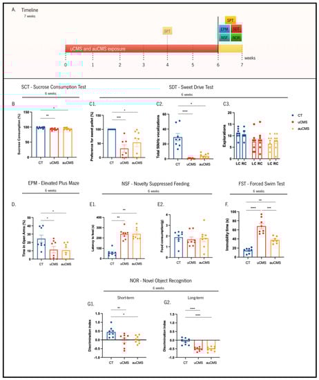 Effects of uCMS- and auCMS exposure in different behavioral dimensions at the sixth week of the protocol. Experimental timeline (A). Assessment of anhedonic behavior through the sucrose consumption test (SCT) and (B) The sweet-drive test (SDT) (C1–C3). Assessment of anxiety-like behavior through the elevated plus maze (EPM) (D) and the novelty suppressed feeding (NSF) tests (E1,E2). Assessment of depressive-like behavior through the forced swimming test (FST) (F). Assessment of cognitive impairments through the novel object recognition (NOR) test, both at short-term (G1) and long-term (G2). Abbreviations: CT—control; uCMS—manual stressed animals; auCMS—automated stressed animals; LC—left chamber (sweet pellet); RC—right chamber (regular food). Data are presented as mean ± SEM. * p < 0.05; ** p < 0.01; *** p < 0.001; **** p < 0.0001. n = 8 animals per group.