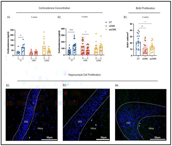 Effects of uCMS- and auCMS exposures in different physiological dimensions. Measurement of corticosterone serum levels on the fourth (A1) and sixth week (A2). Assessment of hippocampal dentate gyrus cell proliferation through BrdU immunostaining (B1). Micrographs depicting examples of BrdU labeled cells (BrdU-positive cells are labeled in green and cell nuclei are labelled with Dapi in blue) in the hippocampal dentate-gyrus of control (B2), uCMS-exposed (B3) and auCMS-exposed (B4) animals. Abbreviations: CT—control; uCMS—manual stressed animals; auCMS—automated stressed animals. Data are presented as mean ± SEM. * p < 0.05; ** p < 0.01; **** p < 0.0001. n = 7–18 samples per group. Scale bar = 50 µm.