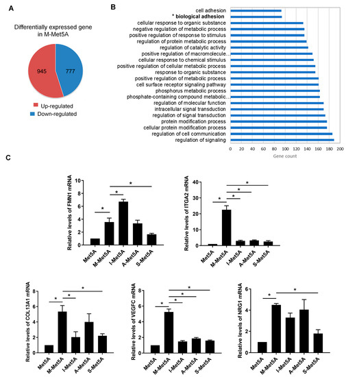 Effect of macrophages on expression of adhesion-related genes in mesothelial cells. (A) mRNA sequencing analysis was performed to identify differentially expressed genes (DEGs) in M-Met5A cells (A fold change of ≥2, log2 normalized read count of ≥4 to minimize false counts). (B) Functional analysis for the differentially expressed genes in macrophage-stimulated mesothelial cells. The up-regulated 945 genes in M-Met5A cells were classified by DAVID analysis. The figure shows the number and percentage of significantly modulated genes that fit into several ontology function groups, including biological adhesion (94 genes) and cell adhesion (93 genes). (C) Real-time RT-PCR shows the expression of five selected genes (FMN1, ITGA2, COL13A1, VEGFC, and NRG1) in control, M-Met5A, I-Met5A, A-Met5A, and S-Met5A cells. * p < 0.05.