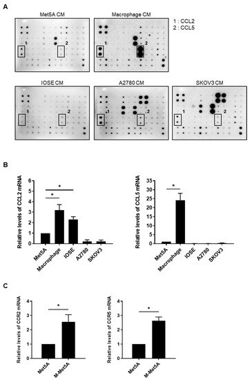 Production of CCL2 and CCL5 by macrophages and enhanced expression of CCR2 and CCR5 in macrophage-stimulated mesothelial cells (A) A cytokine array was used to analyze the cytokine/chemokine profiles of the conditioned medium (CM) of Met5A, macrophage, IOSE, A2780, and SKOV3 cells. (B) Real-time RT-PCR was performed to measure the mRNA levels of CCL2 and CCL5 in Met5A, macrophages, IOSE, A2780, and SKOV3 cells. (C) The mRNA levels of CCR2 and CCR5 were evaluated and quantified in Met5A and M-Met5A cells by real-time RT-PCR. * p < 0.05.