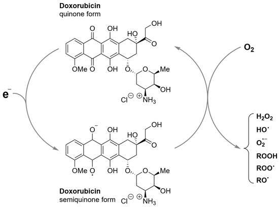 It is well known that doxorubicin can enzymatically generate ROS (Figure 1) [7]. Several oxidoreductases, such as cytochrome P450 reductases, xanthine oxidase, and NADH dehydrogenase (complex I) of the mitochondrial electron transport chain, can convert the quinone moiety of doxorubicin into a semiquinone [38]. This semiquinone then swiftly regenerates, converting O2 into ROS, such as superoxide anion and H2O2, that can be subsequently converted, generally via the Fenton reaction, into hydroxyl radicals [39].