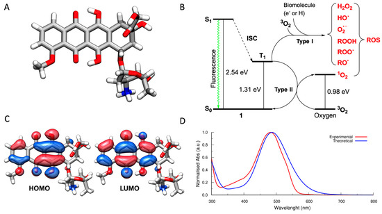 (A) A 3D representation of the most stable tautomer of the doxorubicin molecule. (B) Jablonski diagram of doxorubicin. (C) HOMO and LUMO of doxorubicin. (D) Experimental (red line) and calculated UV–Vis spectra of doxorubicin.