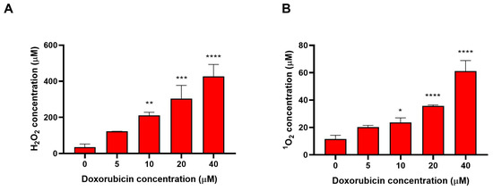 Quantification of ROS generated through type I (A) and type II (B) mechanisms as a function of doxorubicin concentration after 30 min of white light irradiation. (A) Amplex Red assay for H2O2 detection. (B) ABMDMA assay for 1O2 detection. Results are expressed as mean ± SD. * p < 0.05; ** p < 0.01; *** p < 0.001; **** p < 0.0001 vs. control (doxorubicin 0 μM).