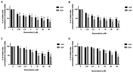 Percentage (%) of Jurkat (A), A-431 (B), MCF-7 (C), and MDA-MB-231 (D) viable cells after treatment with doxorubicin for 2.5 h followed or not by 30 min light irradiation and 24 h recovery in drug-free complete medium. * p < 0.05; ** p < 0.01; *** p < 0.001; **** p < 0.0001 vs. untreated cells. # p < 0.05; ## p < 0.01; ### p < 0.001 vs. nonirradiated cells.
